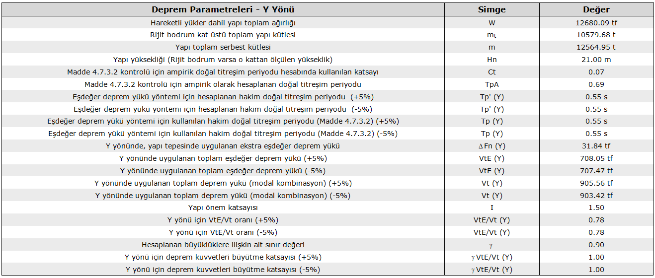 The base shear force is calculated by the above equation. The mass and building importance coefficient used in this calculation and the base shear force determined as a result of the calculation are tabulated in the Dynamic Analysis report.