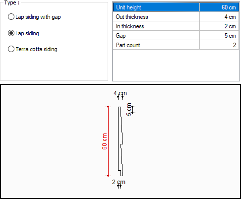 Out thickness It determines the thickness of the part of the overlap (the thickest point) in the lap siding. |