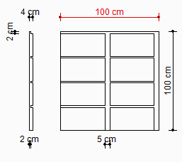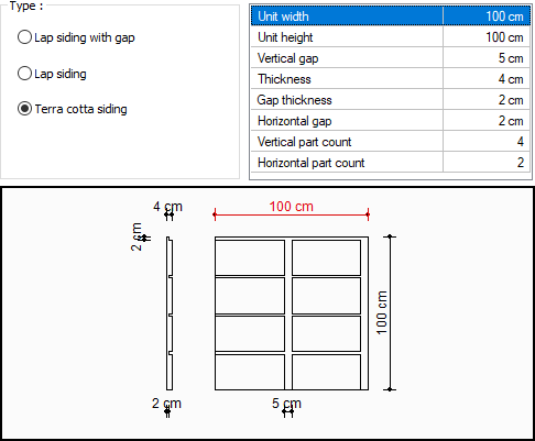 Different views are obtained by arranging the unit dimensions of the terra cotta siding. The dimensions of the unit element appear in the table in the siding settings dialog. While giving the dimensions, the change of the shape according to the entered dimensions is followed from the front view below. Clicked size line is displayed in red in the preview.