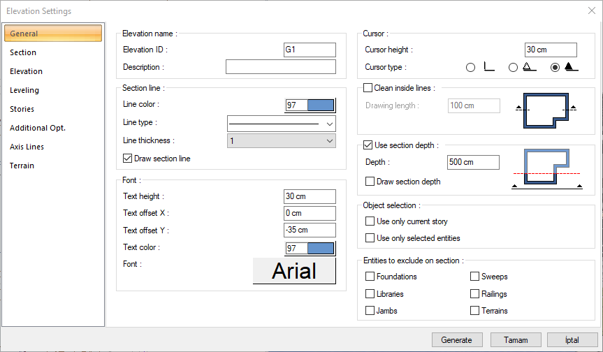 Enter the section/elevation settings dialog.