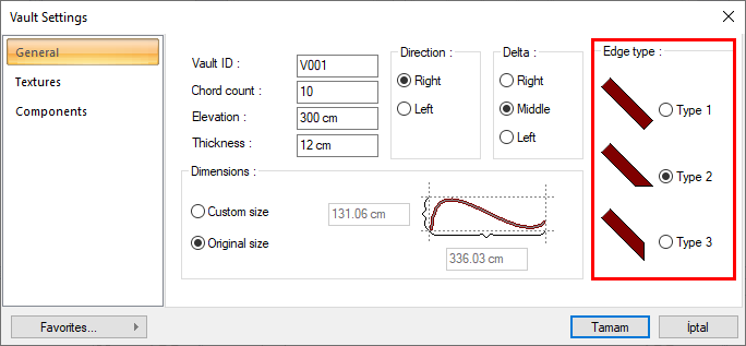 With the eaves types feature, roof, dome and vault eaves can be changed by choosing one of the eaves type options.