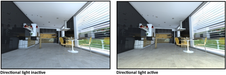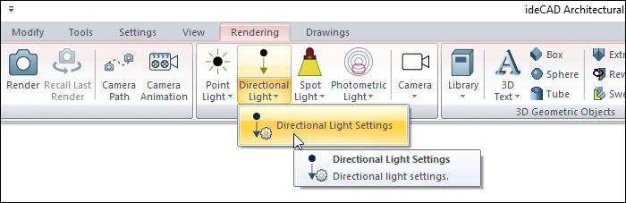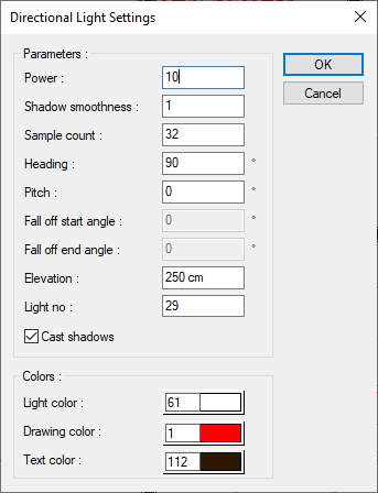 With the Directional Light Settings command, settings such as power, heading, pitch, elevation, light color of the light source are accessed.