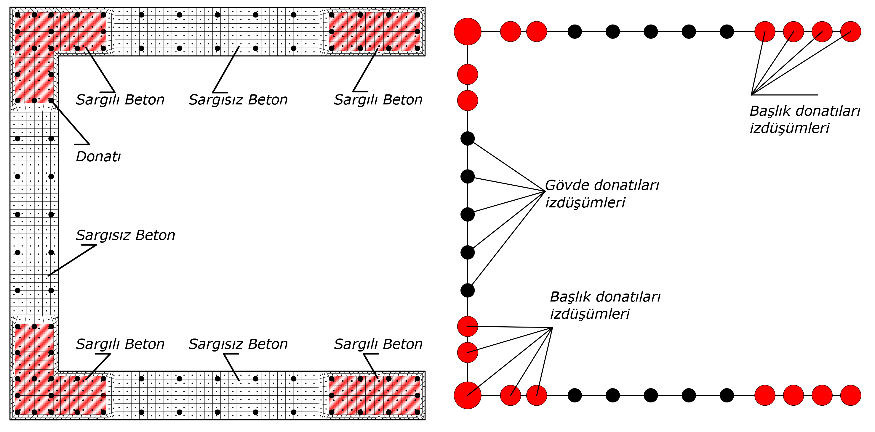 Concrete material is defined by nonlinear two dimensional finite elements, reinforcement material by nonlinear bars Finite element mesh is automatically created to be compatible with reinforcement bars, depending on the condition of confined-uncoated concrete and reinforcement.