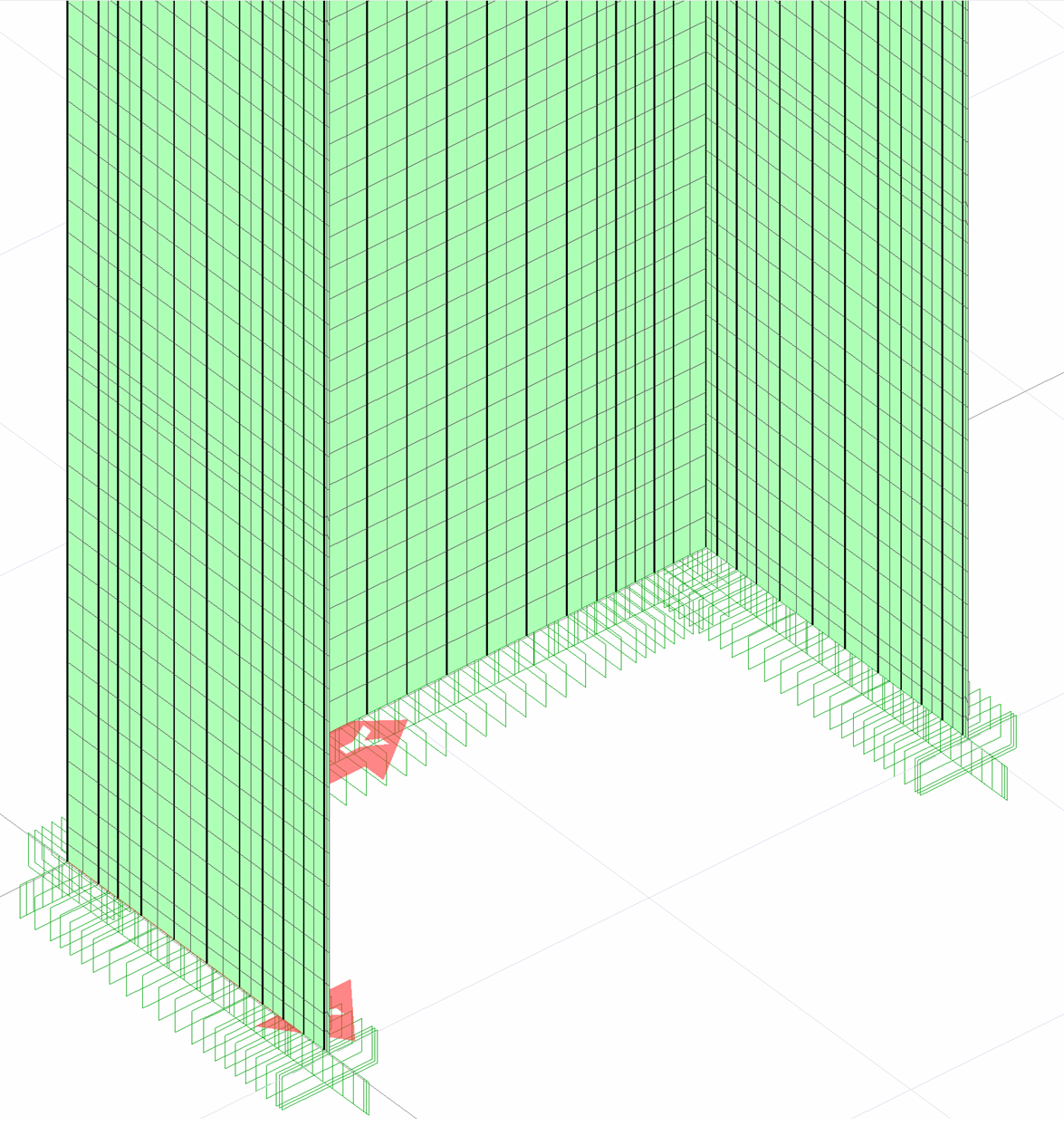 In the polygon wall analysis model shown below, dark colored black lines show the reinforcements and those shown in green indicate two dimensional nonlinear concrete finite elements.