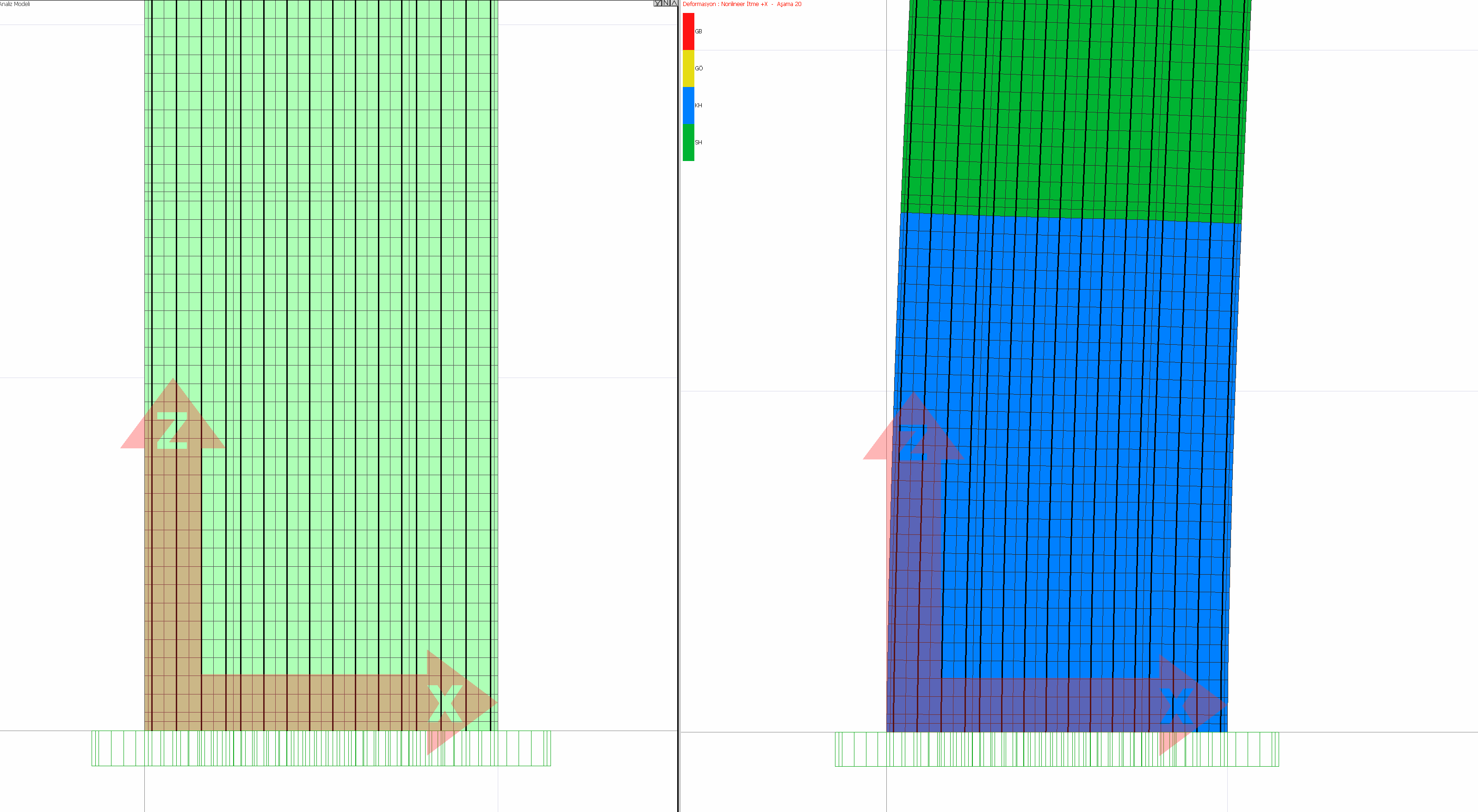Concrete and reinforcement material are defined according to the material models specified in TBDY ANNEX 5A. Concrete material model is modeled with nonlinear shell finite elements. A confined concrete model is used in the header area of the curtains and an uncovered concrete model is used in the body area. The reinforcement material model is created in harmony with two dimensional finite elements.