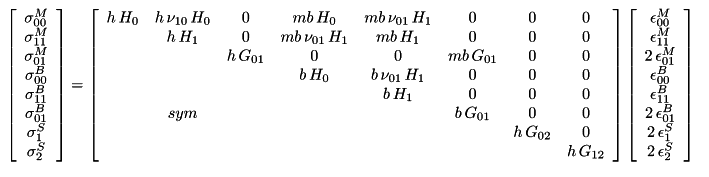 The stress-strain matrix of a two-dimensional finite element defined by an orthotropic material is defined as follows. In this matrix, the terms σ00M and σ11M refer to in-plane axial stresses, σ01M terms to in-plane shear stresses, σ00B and σ11B terms to out-of-plane bending stresses, σ01B to in-plane bending stresses, σ1S and σ2S to out-of-plane shear stresses.