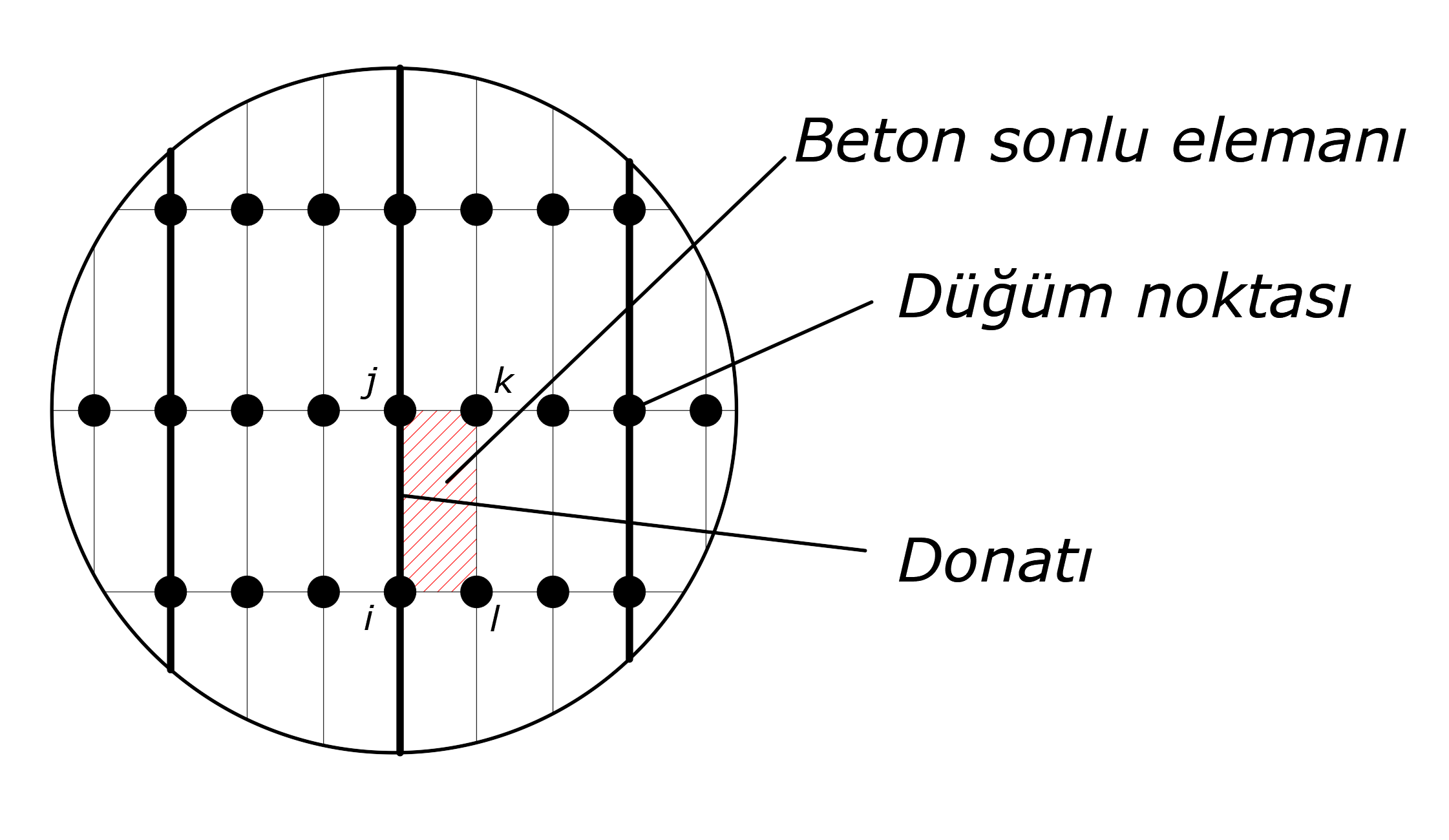 In the picture below, one of the non-linear two-dimensional concrete finite elements is hatched in red and the reinforcement model is shown in bold. The reinforcement material is defined between the nodes i and j in this picture, with the nodes (i, j, k, l) of a rectangular concrete finite element. When calculating the reinforcement strain, the elongation value between joints i and j is obtained by dividing the distance between the initial positions of the i, j joints.