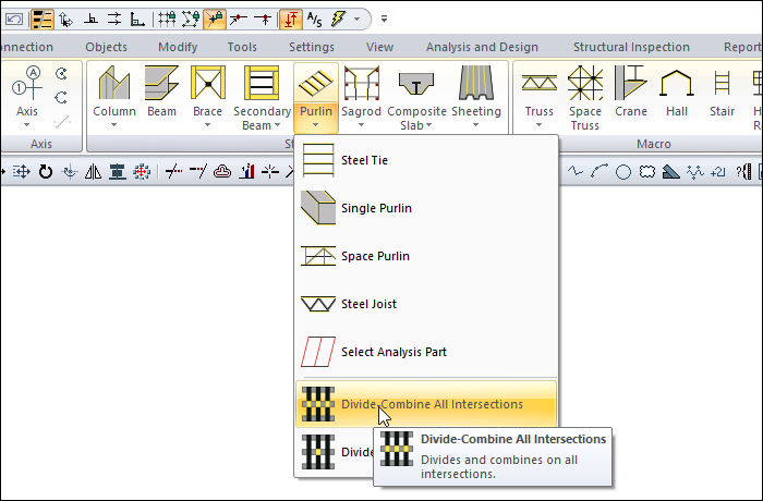 With the Divide-Combine All Intersections command, the purlins are split in main beams, columns and/or trusses or split purlins are combine.