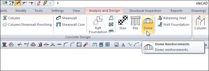 After analysis, you can access it by clicking on the Dome command under the Concrete Design title of the ribbon menu Analysis and Design tab .