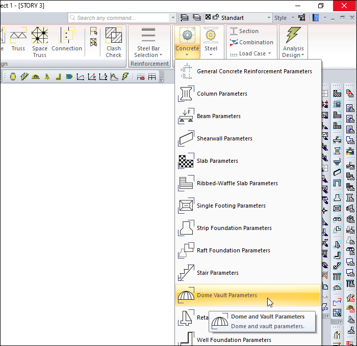 With the Dome Vault Parameters command, the design parameters used in Concrete Dome and Vault Design are determined. Concrete cover, maximum and minimum reinforcement percentage etc. parameters are determined from the Dome & Vault parameters window.