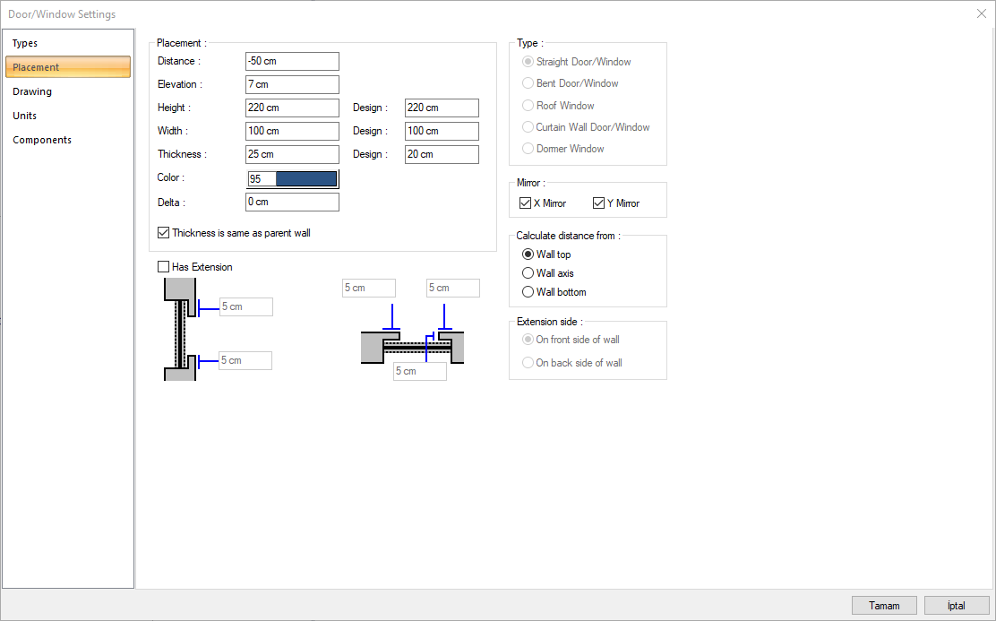 In the Door/Window Settings dialog that opens, switch to the Placement tab.