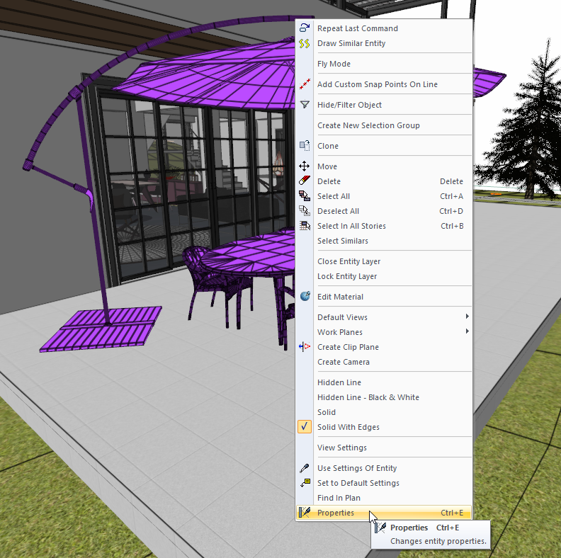 Select the object you want to show as a bounding in the 3D model and click on the Properties line from the pop-up menu by clicking the right mouse button.