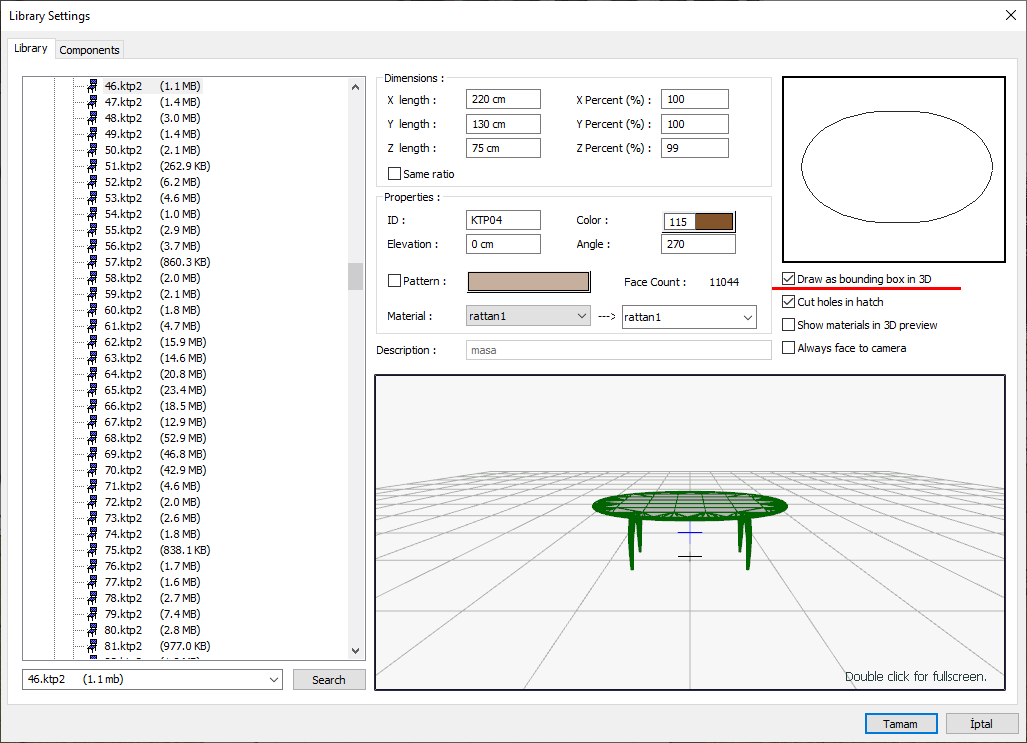 With the Draw as Bounding Box in 3D option libraries are made into linear frames and work in perspective faster.