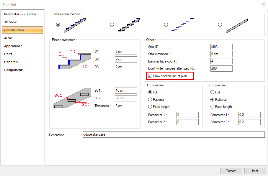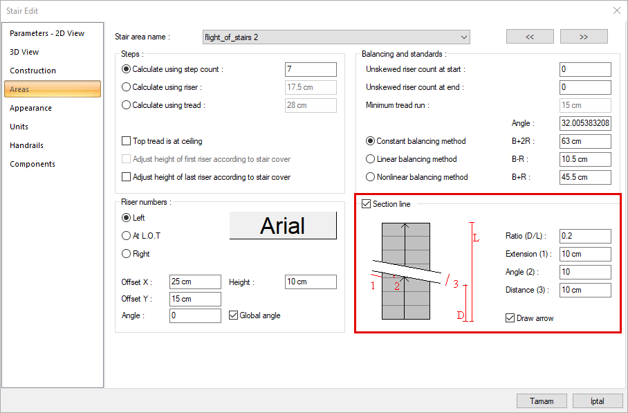 Section line ![]() If the box is checked, the section line is drawn on the relevant stair area (flight) according to the entered parameters. If not marked, the section line is not drawn. |