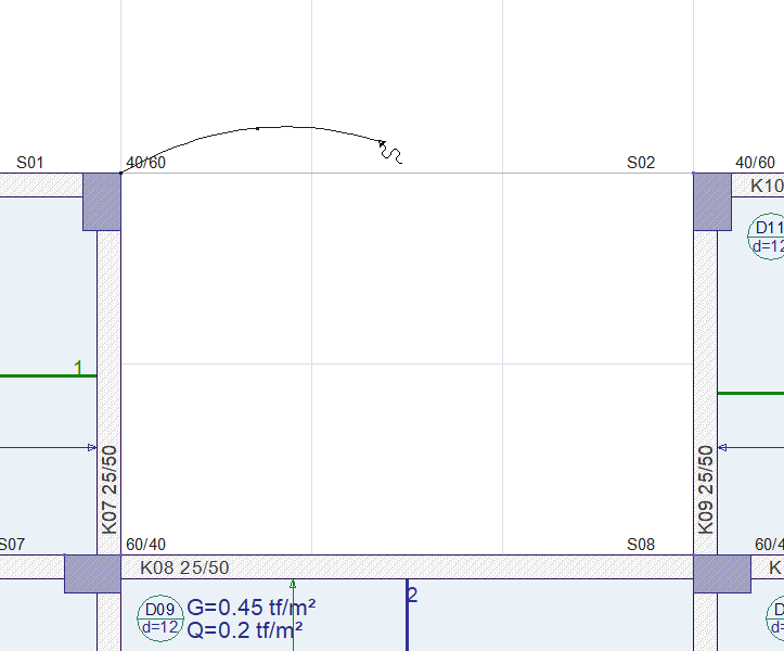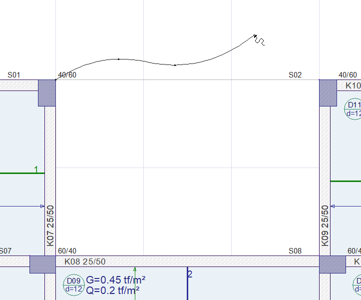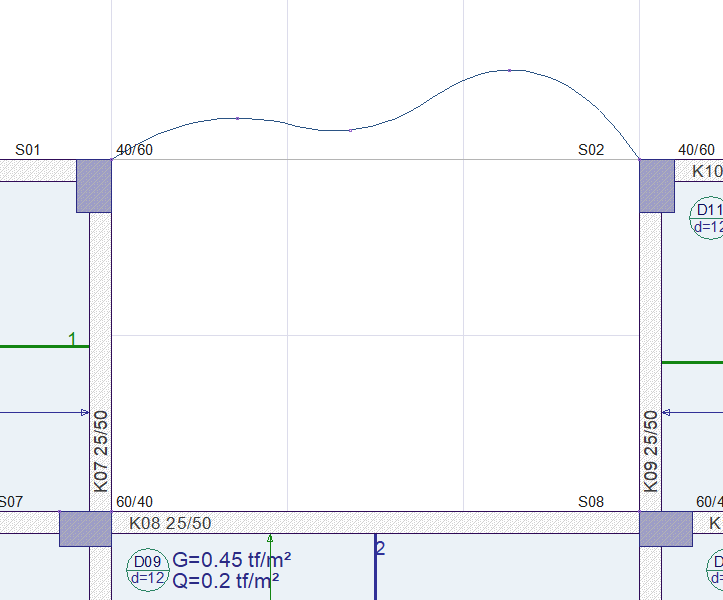 With the Curve Slab Edge command, the slab edge definition is made in curve form between each point clicked with the mouse. By clicking on the intended points, the definition of cantilever in curve form, slab without end or slab without beams is made.