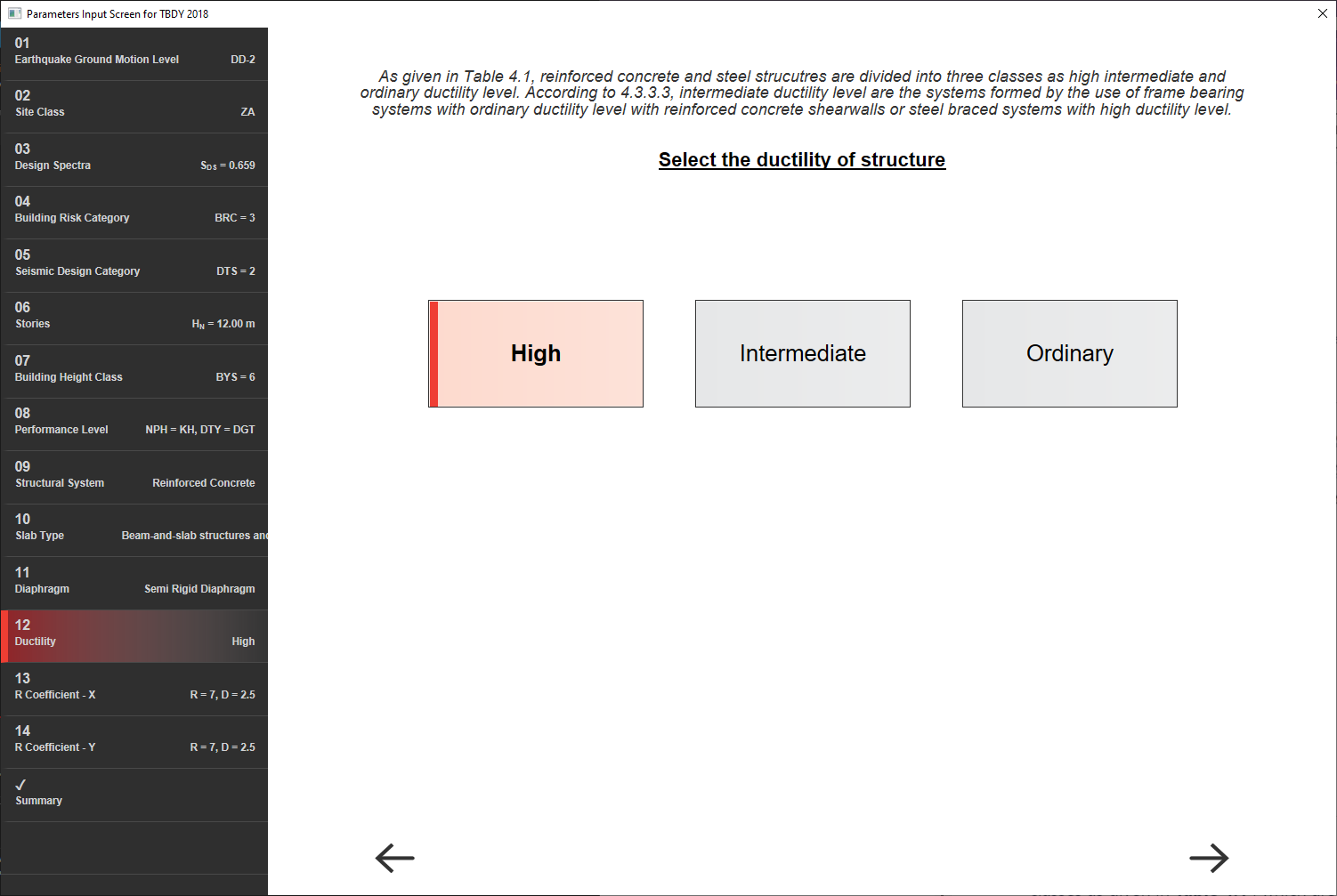 High ductility, intermediate and ordinary system choices have application limits. The program automatically checks these limits in the wizard within the framework of the items listed below and does not allow ordinary ductility level or intermediate selection when necessary.