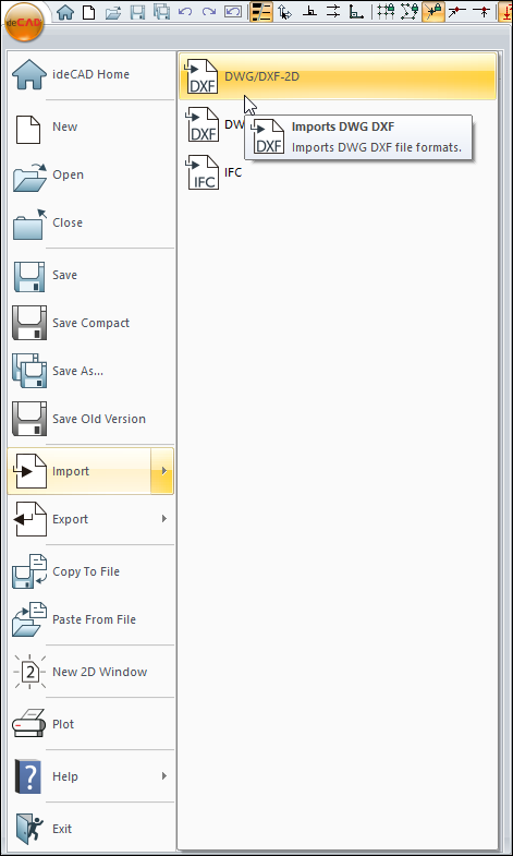DWG/DXF-2D (Import) command is used to open .dwg and .dxf files in 2D in ideCAD or load them into the project.