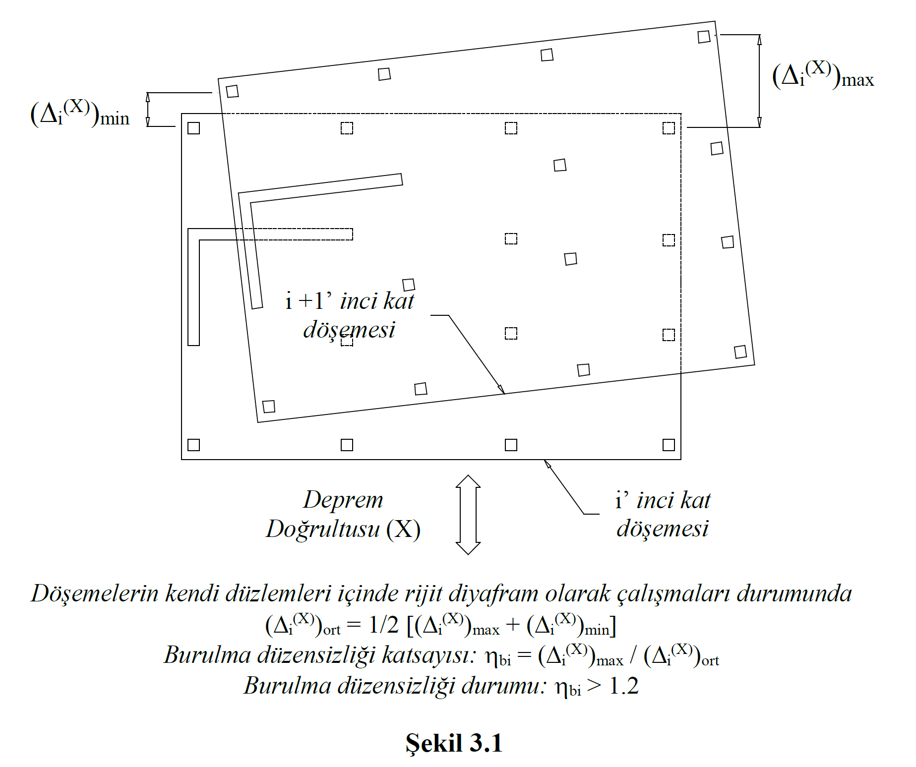 A1 - Torsion Irregularity is the case where the Torsional Irregularity Coefficient η bi , which expresses the ratio of the largest relative displacement at any floor to the average relative displacement at the same direction for any of the two earthquake directions perpendicular to each other , is greater than 1.2 ( Figure 3.1 ).