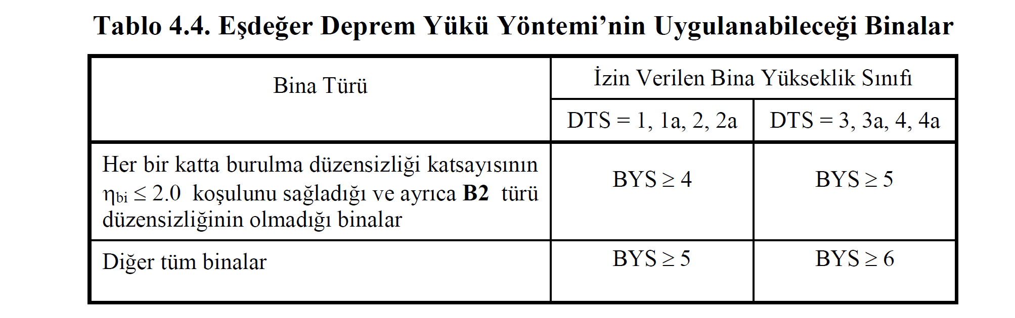 According to Table 3.6 , the calculation of the relative storey drifts is made according to the Equivalent Earthquake Load Method described in Section 4.7 of TBDY, taking into account the effects of + - 5% eccentricity . While Modal Calculation Methods are used in the earthquake calculation of the building, Equivalent Earthquake Load Method is used in B2 type irregularity control.