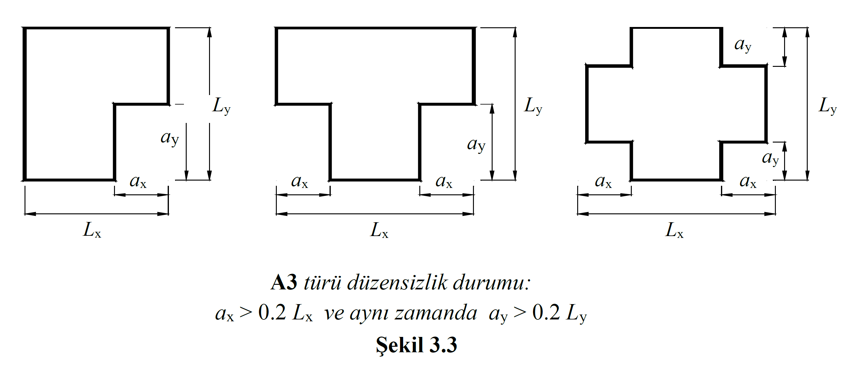A3 type irregularity situation occurs when both the dimensions of the protruding parts of the building floor plan in perpendicular directions to each other are greater than 20% of the total boat in the same direction as indicated in TBDY Table 3.6 . This situation is shown in TBDY Figure 3.3 .