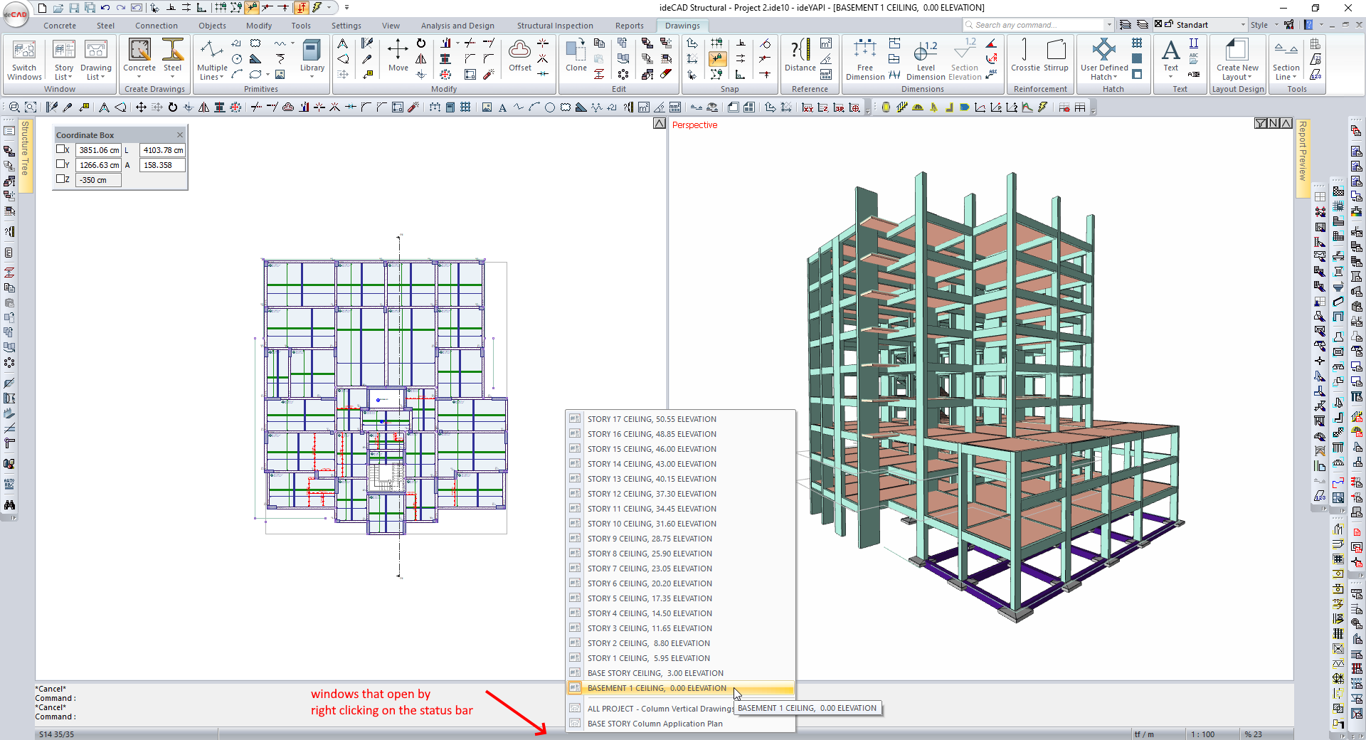 When the right mouse button is clicked on the Status Bar at the bottom of ideCAD, story and drawing windows are listed. By clicking any window from the list, it is easy to switch between windows.