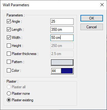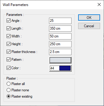 Plaster existing ![]() If checked, only the walls that were drawn as plastered when drawing from the selected walls will be rendered as plastered. |