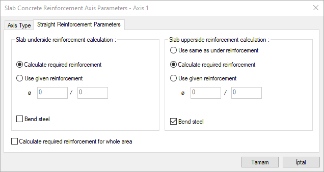 Calculate required reinforcement ![]() If the option is checked, the reinforcement value found as a result of the calculation is used. (The amount of reinforcement found from the design moment is compared with the minimum reinforcement ratios, whichever is greater is used). |