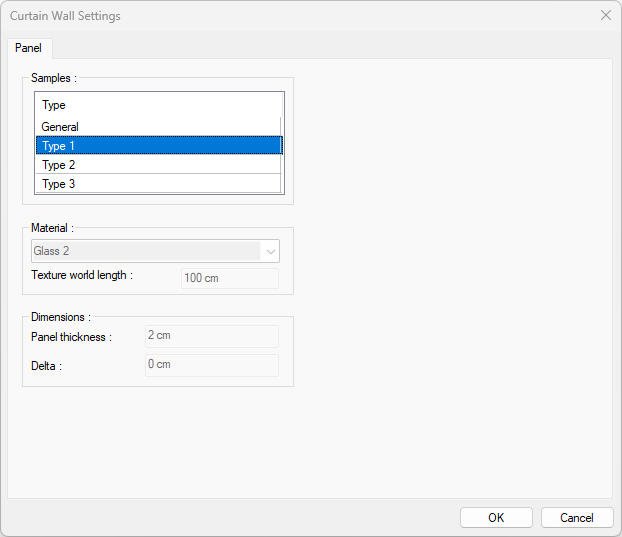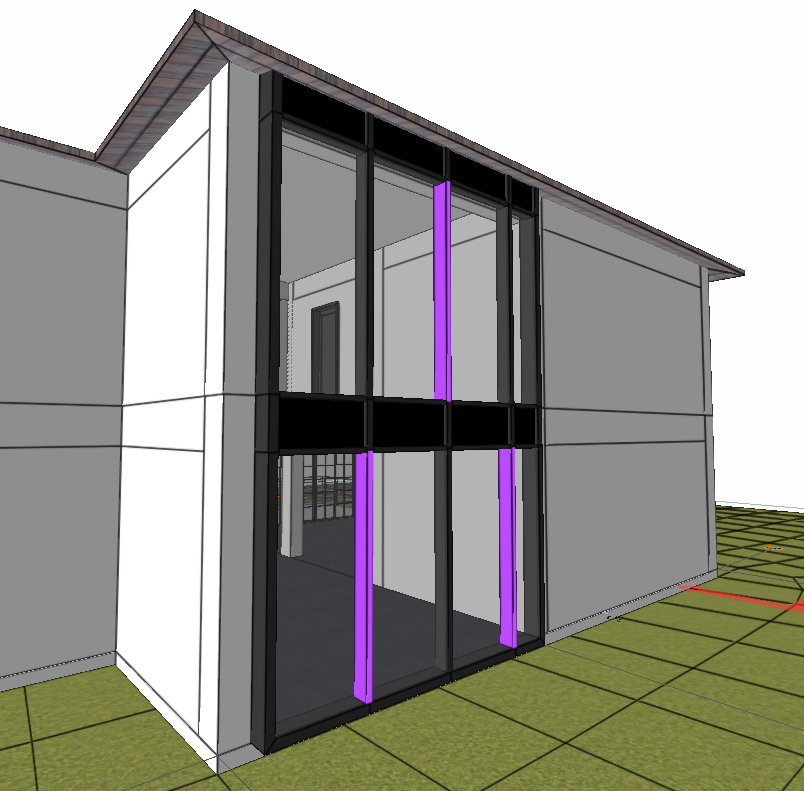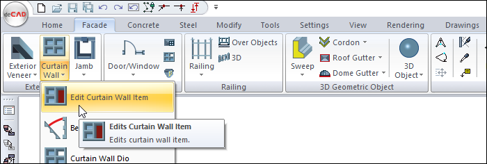 The Edit Curtain Wall Item command allows to change the properties of the modules (mullions, transoms, panels and boundary) that make up the curtain wall element in the 3D view, and to automatically combine the panels by deleting the selected element