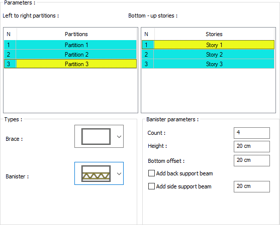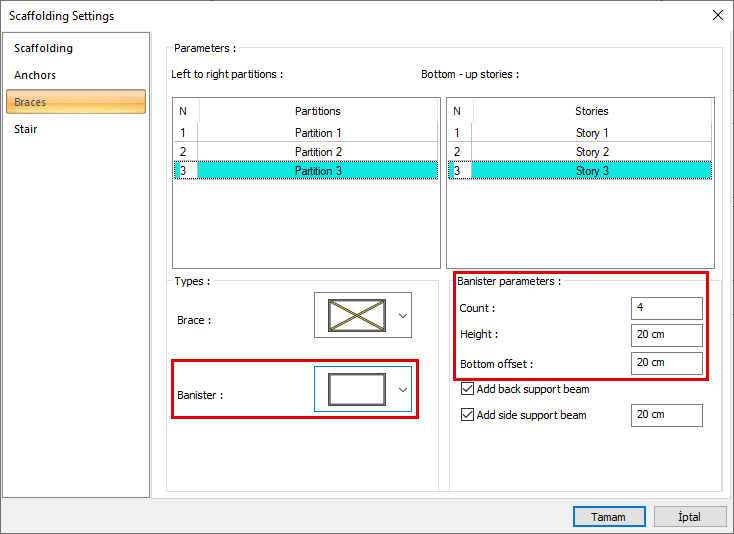 Scaffolding railings are arranged with the scaffolding banister settings. The banister settings from the scaffolding settings dialog braces tab.