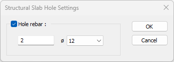 When a hole is opened on the slab, rebar arrangement is made automatically around the edges of the hole. Hole rebar is changed in the structural slab hole settings dialog.
