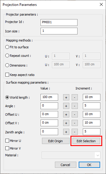 You can access the edit selection feature from the projection parameters dialog that opens when you double-click on the defined planar texture overlay projection .