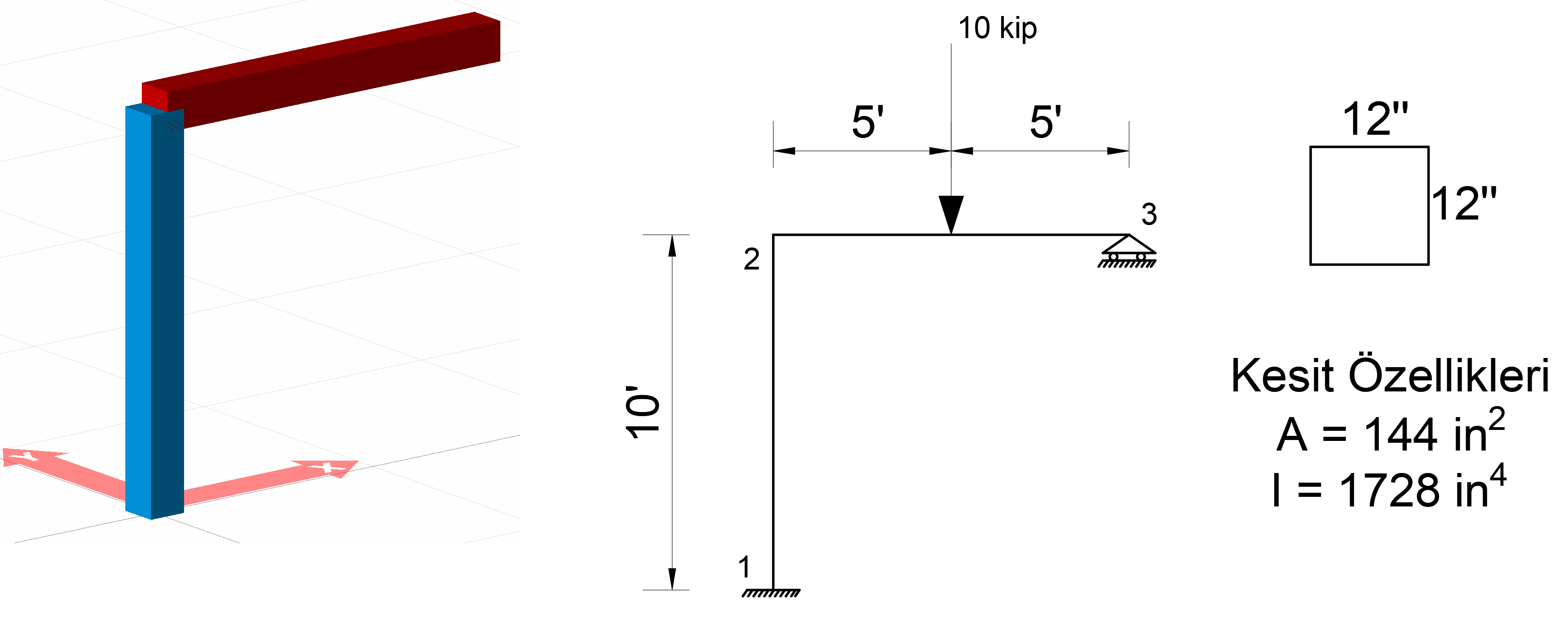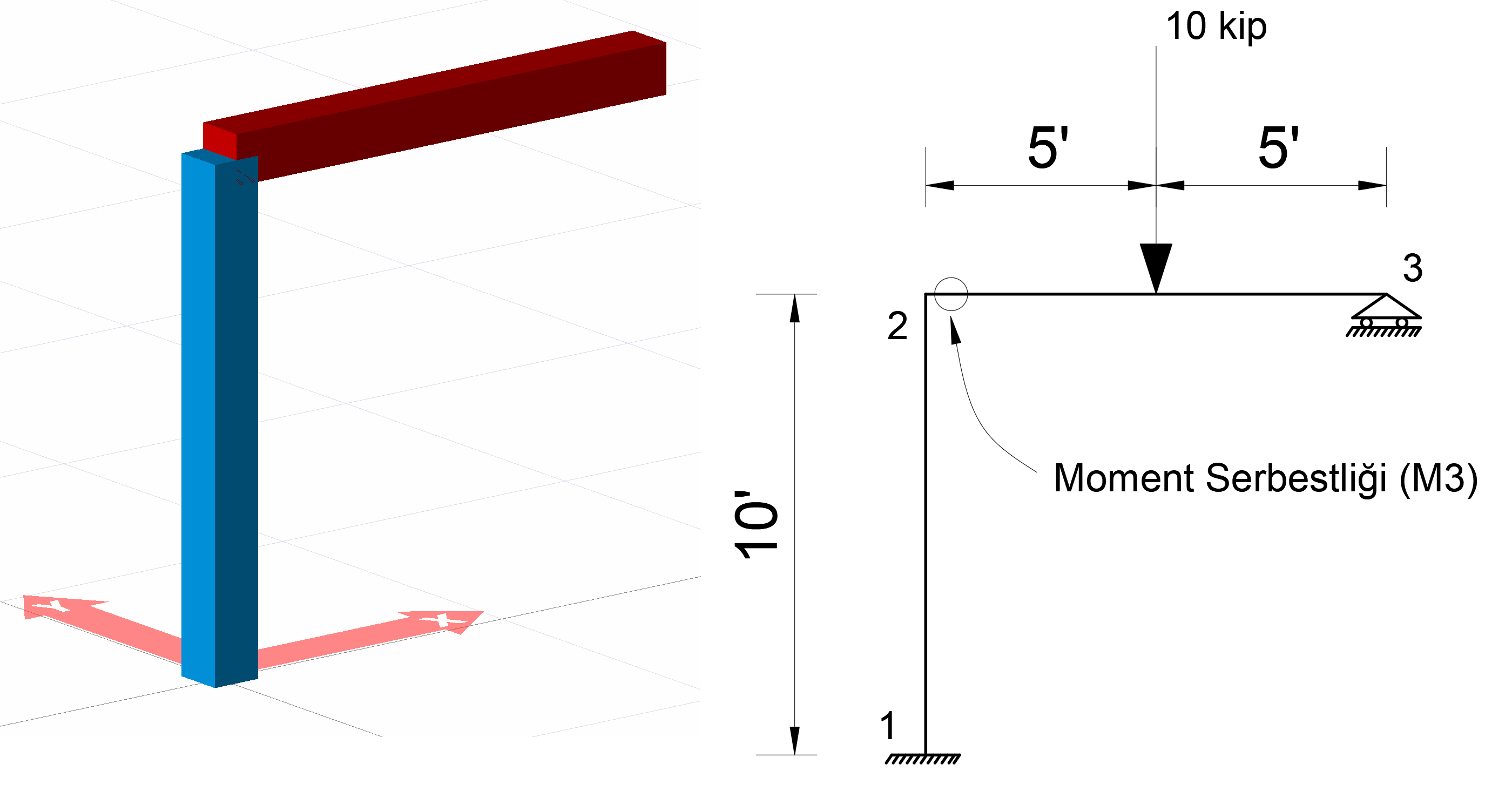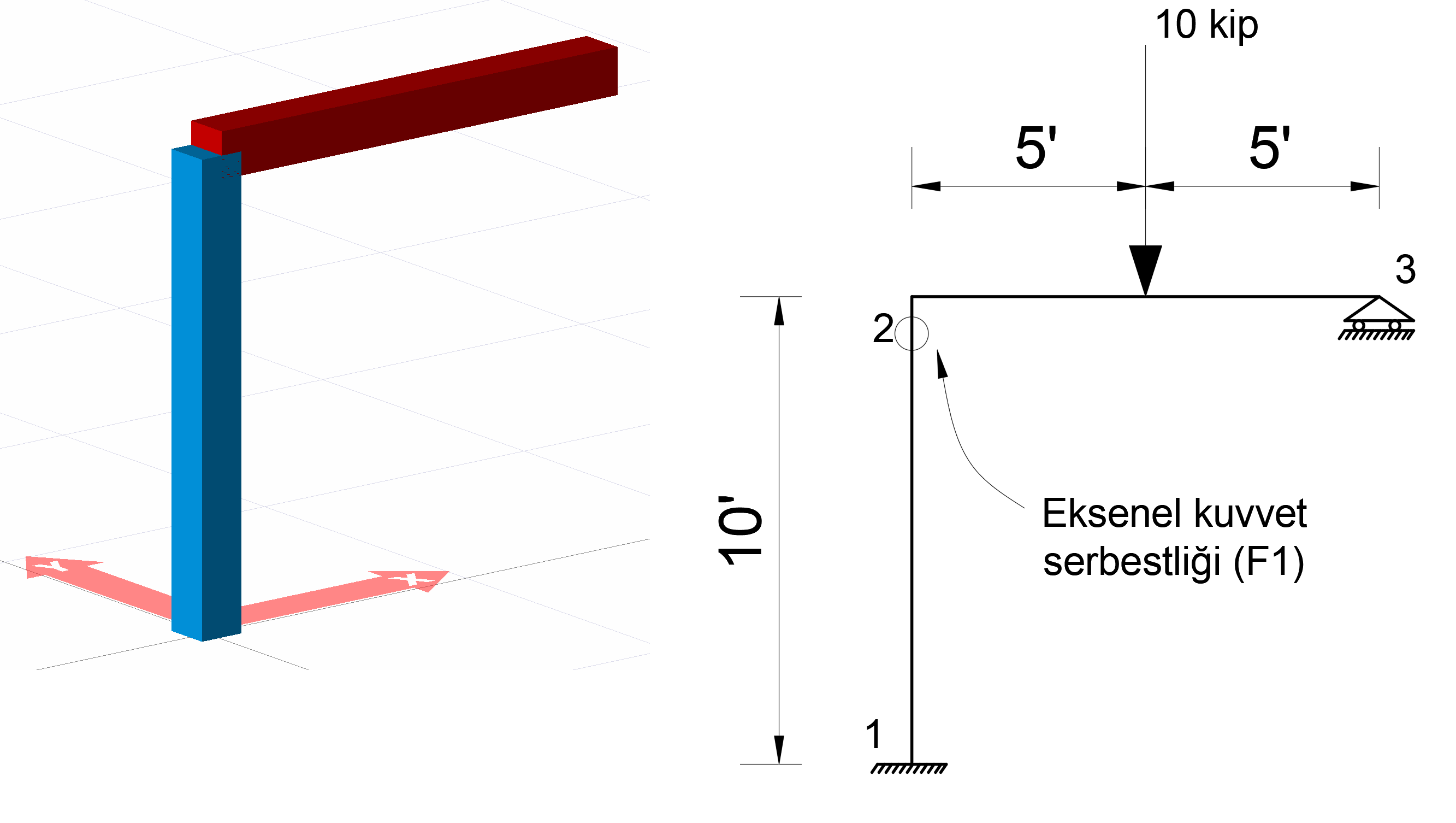 In the above system, a system consisting of 2 sticks and 3 nodes is given. The lengths of these rods are defined as 10 ft. Axial force cerebstence (F1) shall be defined on the end of the rod located at joint number 2 between joints 1-2, slip freedom (F2) and moment freedom (M3) shall be defined on the end of the rod located at joint point 2 between joints 2-3. In case these freedoms are defined, the system will become isostatic. In isostatic systems, internal force diagrams are independent from cross section geometry and material. Therefore, the internal force diagrams of the system will not change in case of a different material or section selection.