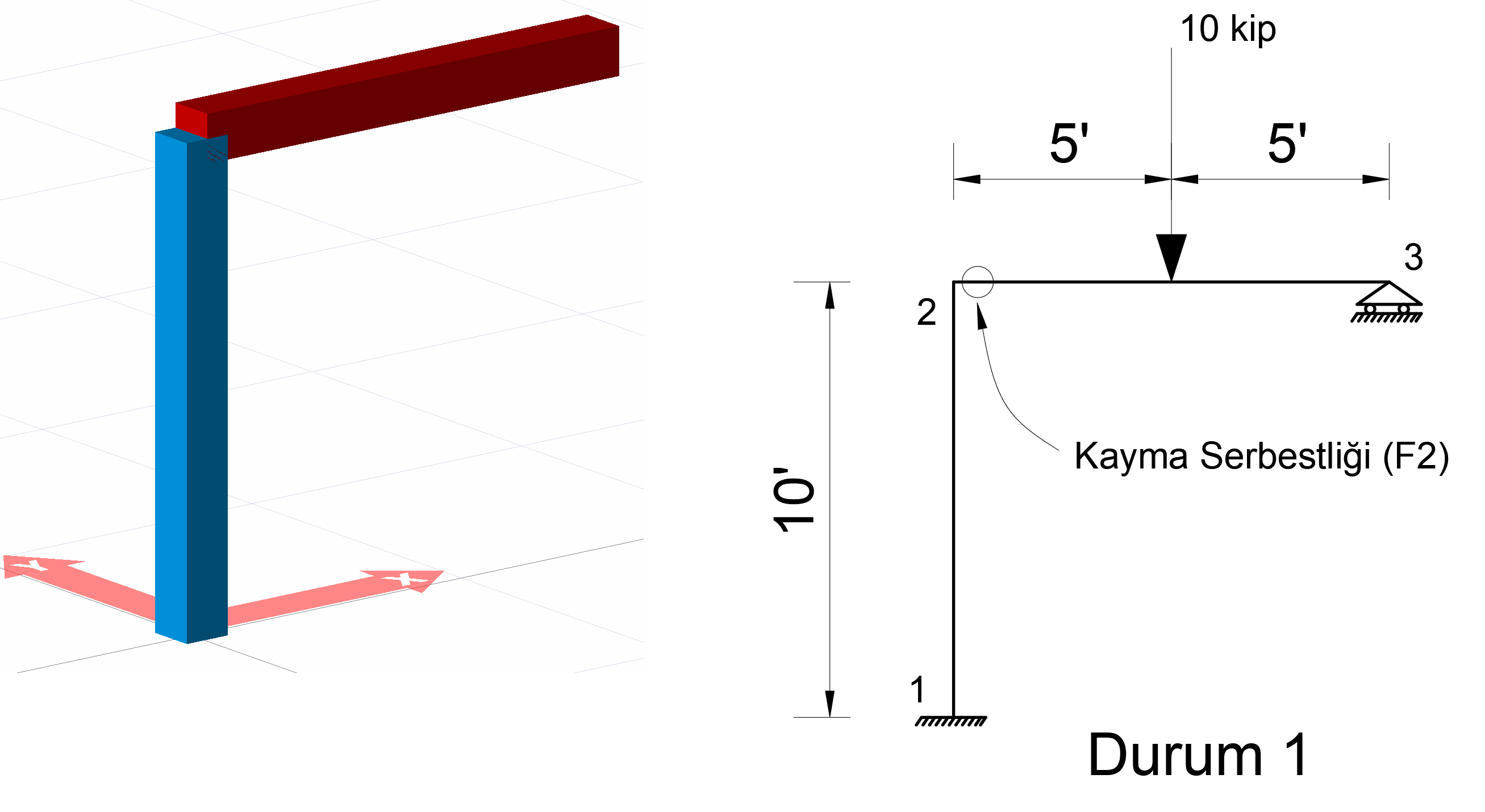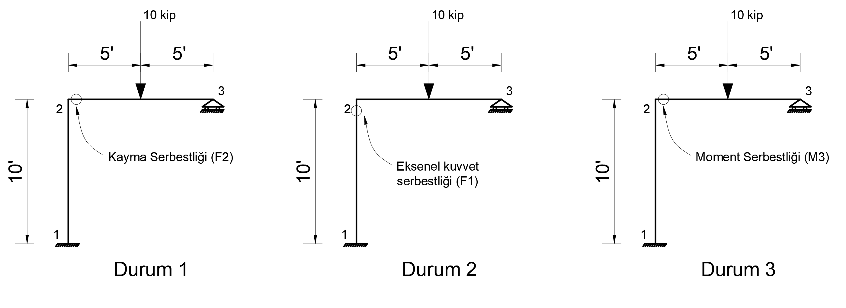 In the above system, 3 support conditions are defined below. These conditions are named Case 1, Case 2 and Case 3. For Case 1, the freedom of sliding (F2) on the end of the rod located at joint 2 between joints 2-3 for Case 2, the axial force cerebstence (F1) to the end of the rod located at joint 1-2 between joint 1-2 for Case 2, and for Case 3 Moment freedom (M3) is defined at the end of the rod between the joints 2-3. A 10 kip single load was applied from the middle of the rod between 2-3 joints in all support conditions.