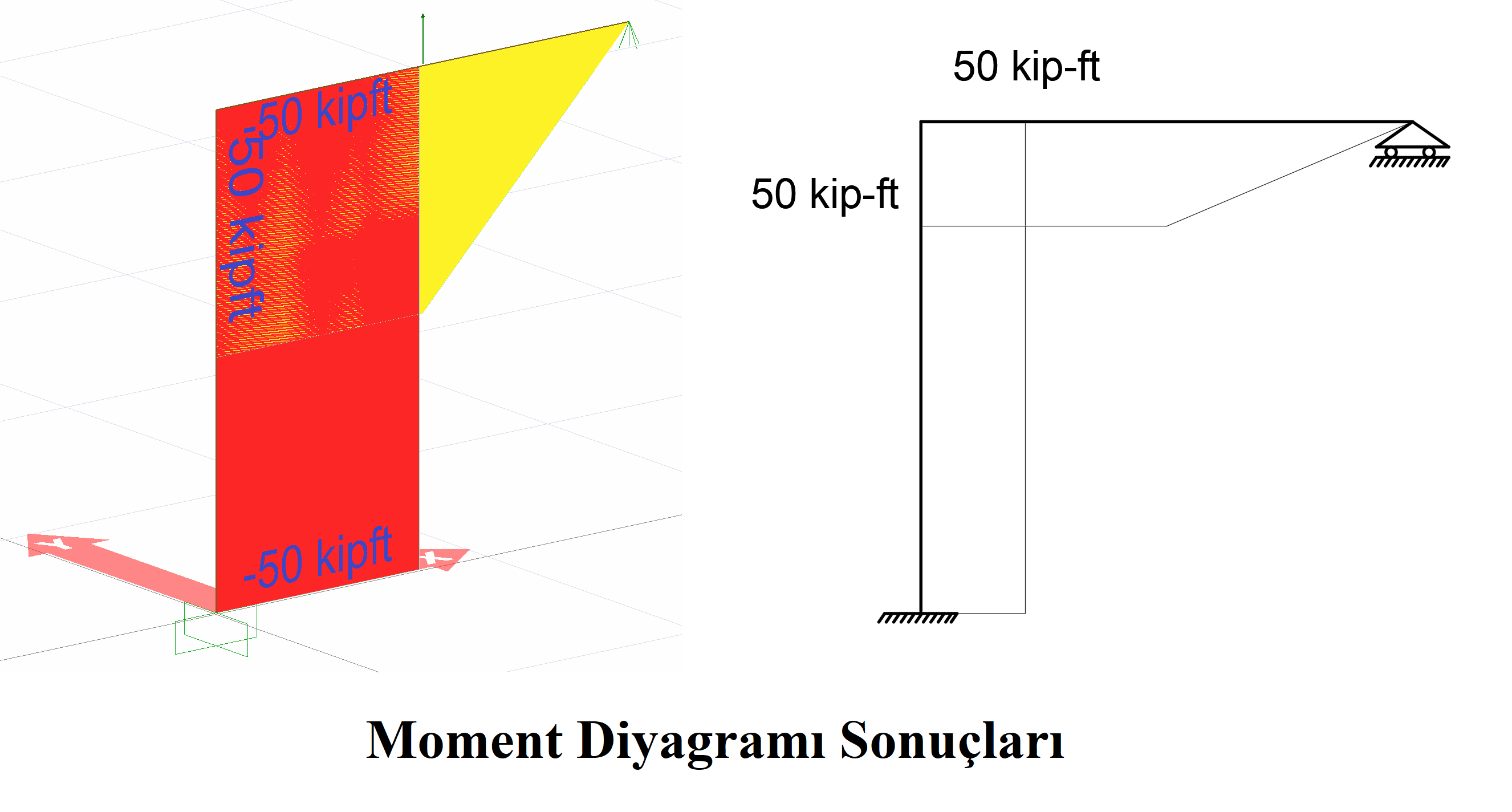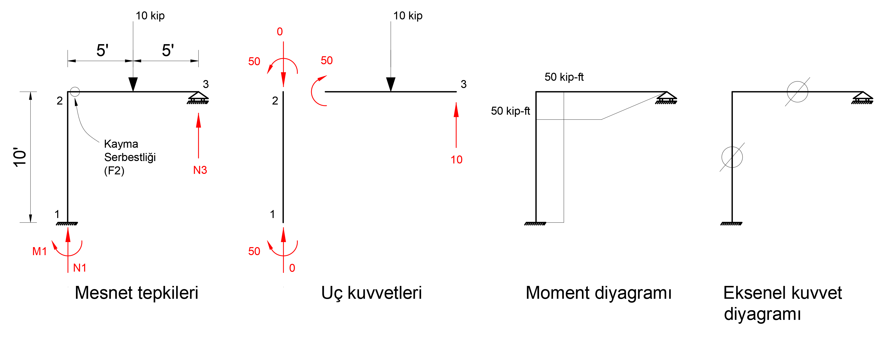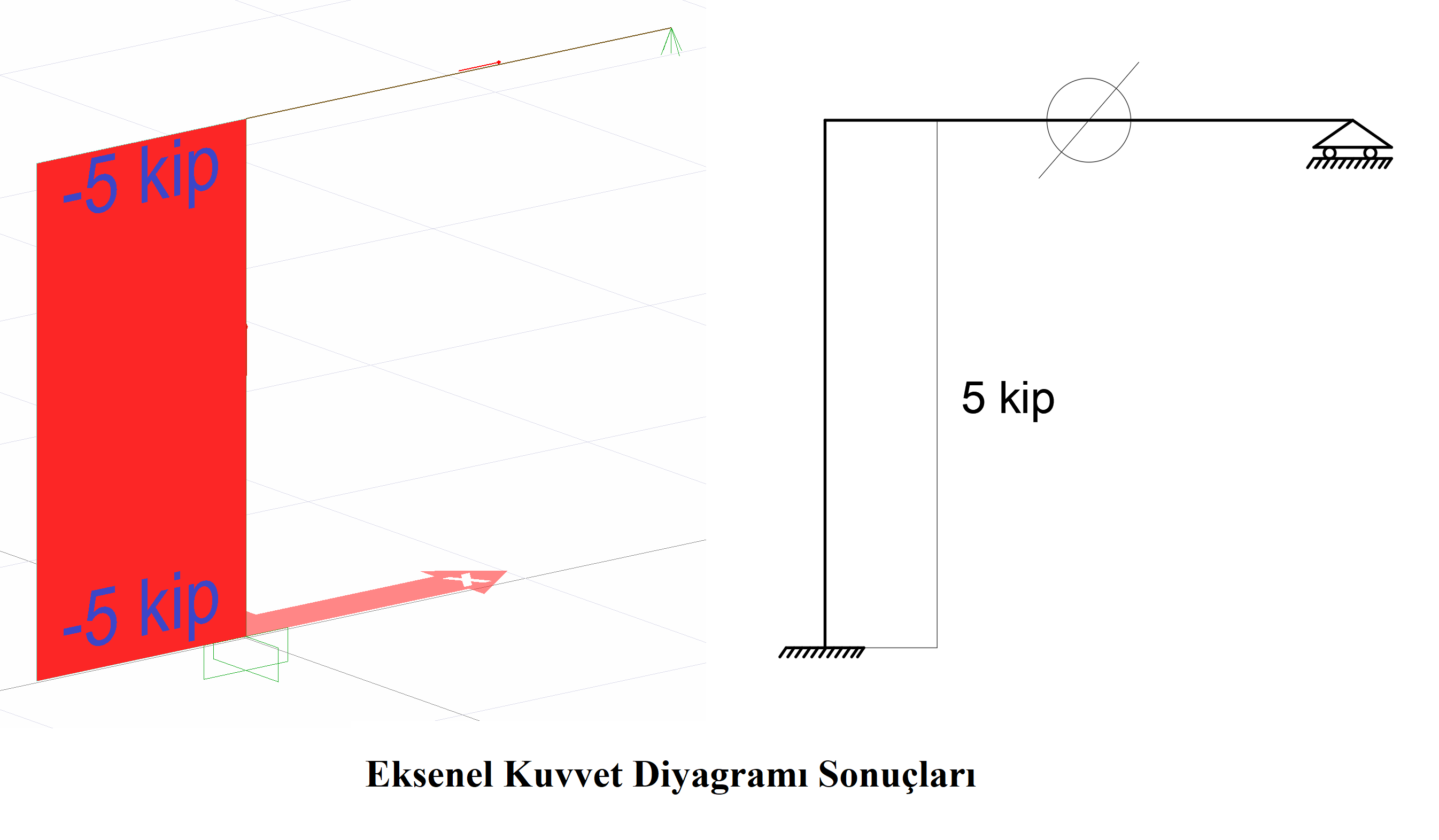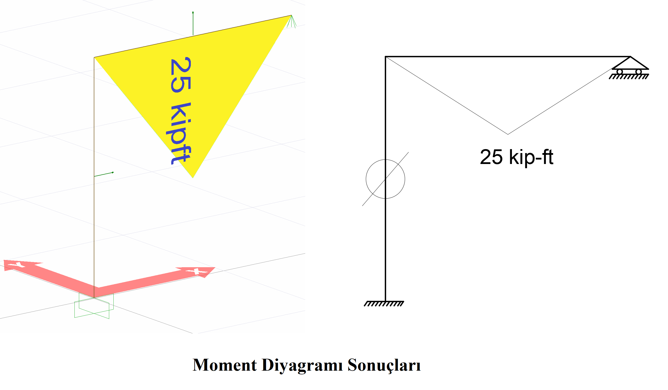 Due to M1 freedom, in the element (column) between 1-2 joints, no moment value has occurred, only an axial force of 5 kip has occurred. Moment freedom at the left end of the element between the 2-3 joints, and at the right end, no moment will occur at these ends from the movable support groove, a moment of 5 * 5 = 25 kip-ft will occur in the middle of the rod due to the singular load effect. In addition, due to the 10 kip vertical load, a 5 kip support reaction will occur on the supports 1 and 3, and a uniformly distributed 5 kip axial force will occur in the column.