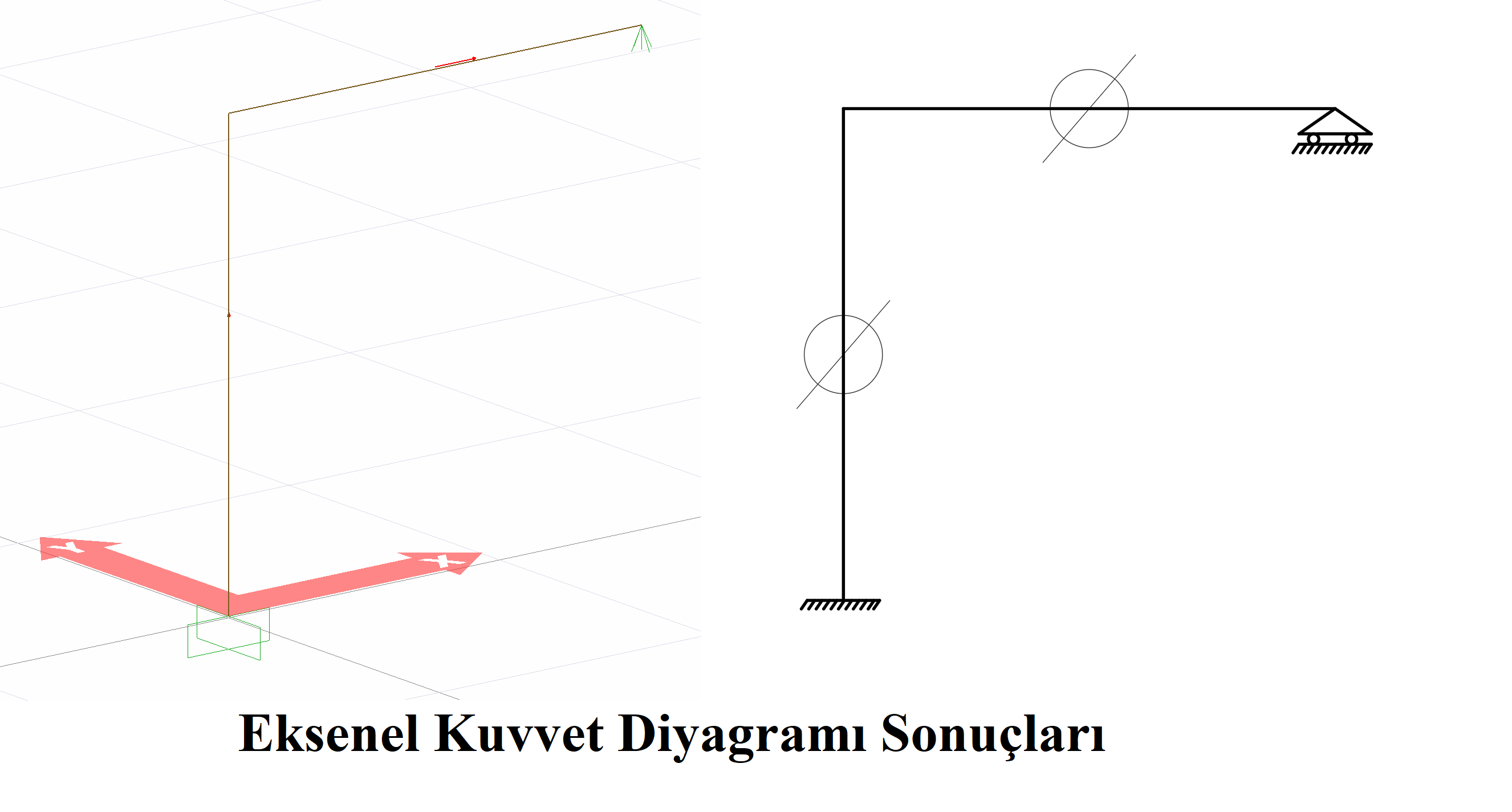 Moment and axial force diagrams of a system consisting of two rods according to 3 different states of freedom were compared with the manual results of ideCAD Structural.