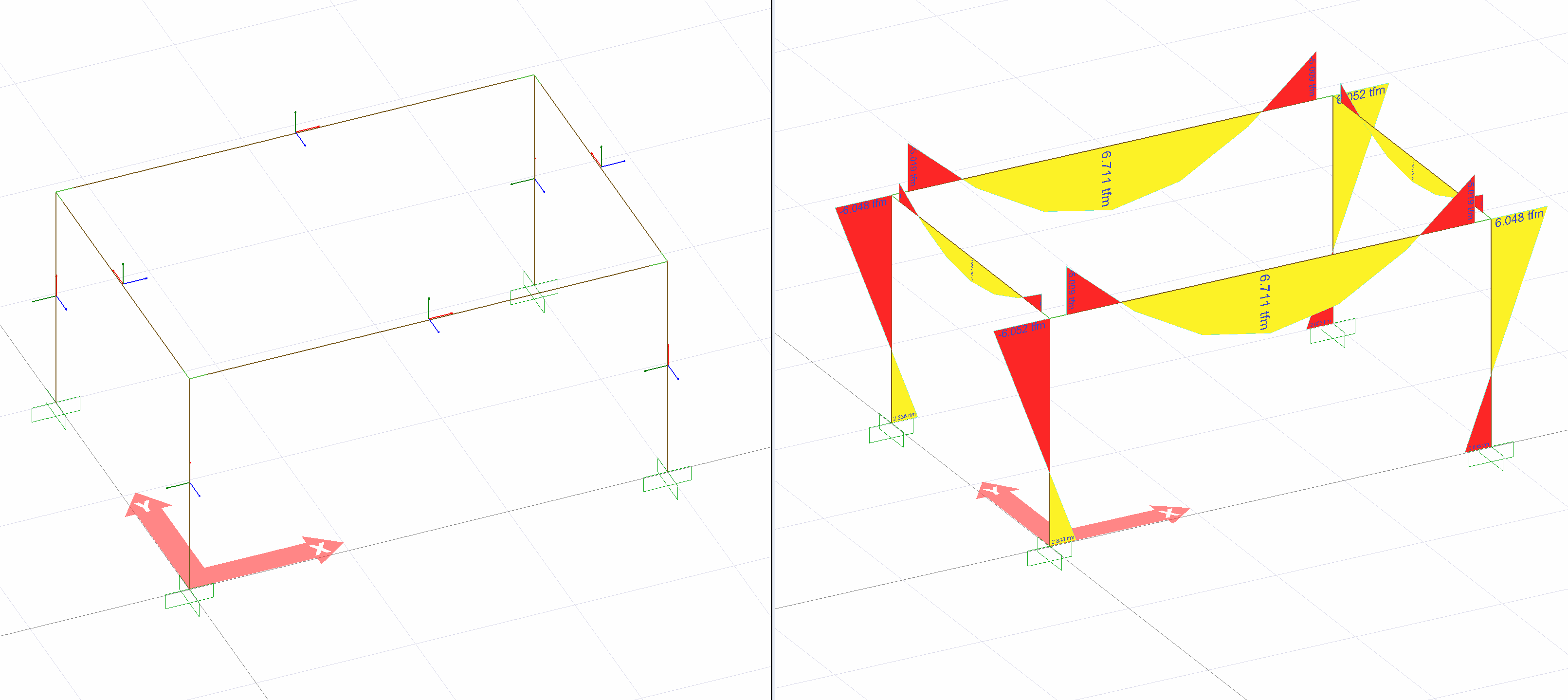 The diagram below shows the local axes and internal force [major bending moment, M3 (maj)] diagram of the elements used in the three-dimensional analysis of a simple model. According to the directional acceptance of the local axes , the forces shown in yellow are positive (+), and the internal forces shown in red are negative (-) bending moments.