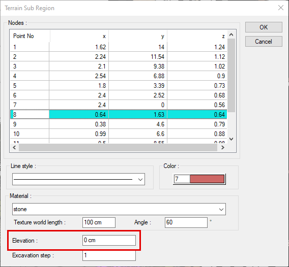 You can access the elevation feature from the terrain sub-region dialog whose elevation is desired to be changed.