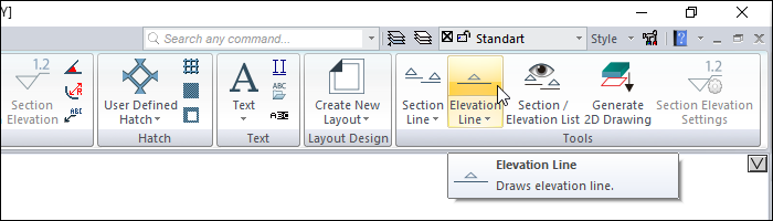 After entering the Section command under the Tools title of the ribbon menu drawings tab, you can access the Elevation command from the Section toolbar .