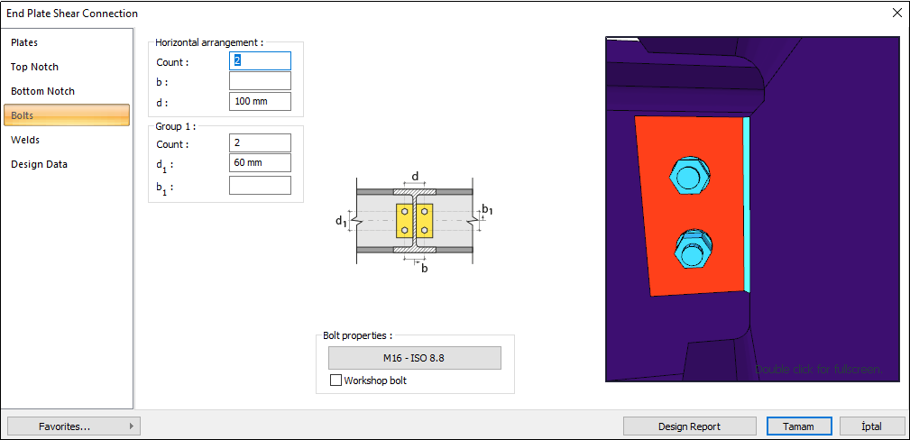 End plate shear connection limit states and geometry checks are done automatically according to AISC 360-16.