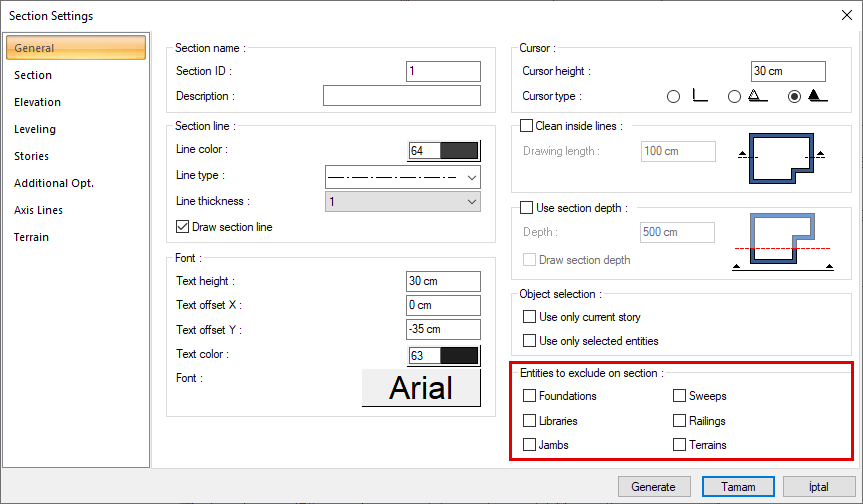 With the feature of Entities to exclude on section, the section/elevation are taken without the objects in the options. The checked objects of foundations, libraries, jambs, sweeps, railings and terrains are not cut off. The section/elevation speed changes according to the marked object/objects.