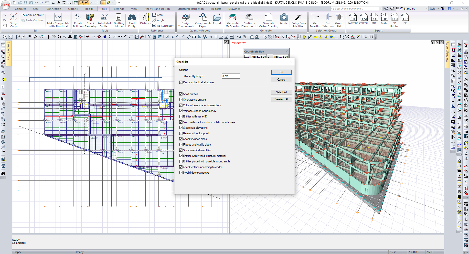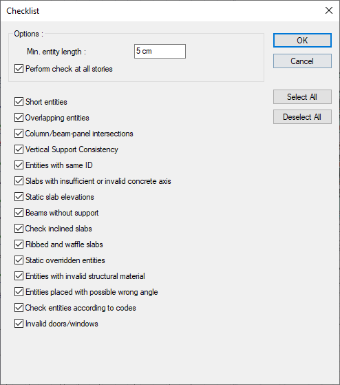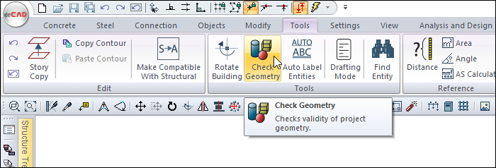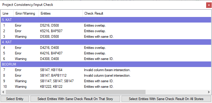 By clicking ”Tools/Geometry Control” or ”Geometry Control” icon from the left toolbar, error/warning control is performed for any story or for the whole project.
