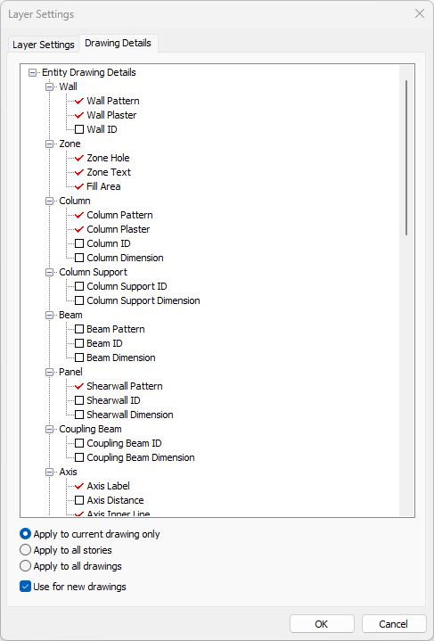 Some layers have sub-layers within themselves. The sub-layers of these layers are listed in the Layer Settings dialog, Drawing Details tab. Sub-layers that are not wanted to appear in the drawing can be turned off from the drawing details tab. You can find detailed information about the subject from the Drawing Details section.