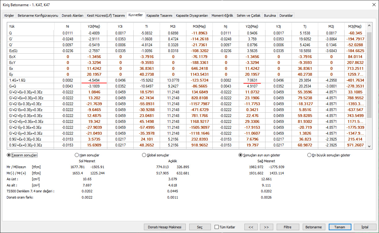 The shear force calculated from the earthquake effects increased with the Resistance Excess Coefficient D together with the vertical loads, 27.90 tf for the left end and 29.33 tf for the right end. These values are not less than Ve = 17.54 tf . Therefore, the shear force to be used in reinforcement design is V e = 17.54 tf .