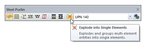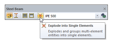 You can access the explode into single elements command from the steel beam and steel purlin toolbars.