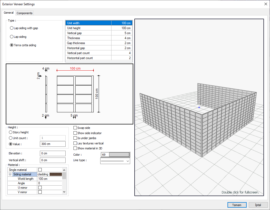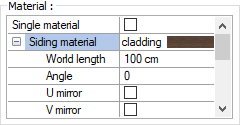 Material ![]() The material to be used on the siding and gap is selected from the list. Surfaces are covered with the selected material and displayed as such in renderings. Texture length is entered into the world length. For example; If 1 is entered, the selected material texture is taken as 1 meter and covered on the relevant walls. In the angle, the angle of the texture is entered. Touch the U and V offset. The motion value in the x and y plane is entered. With U and V mirroring, the texture is symmetrical with respect to the y and x planes. By selecting the single material option, the material selected in "Siding material" is used on all surfaces of the exterior veneer. |
