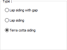 Type ![]() As the exterior veneer, one of the lap siding with gap, lap siding or terra cotta siding types is selected. After the selection is made, the dimensions for the selected type are set in the table on the right. |