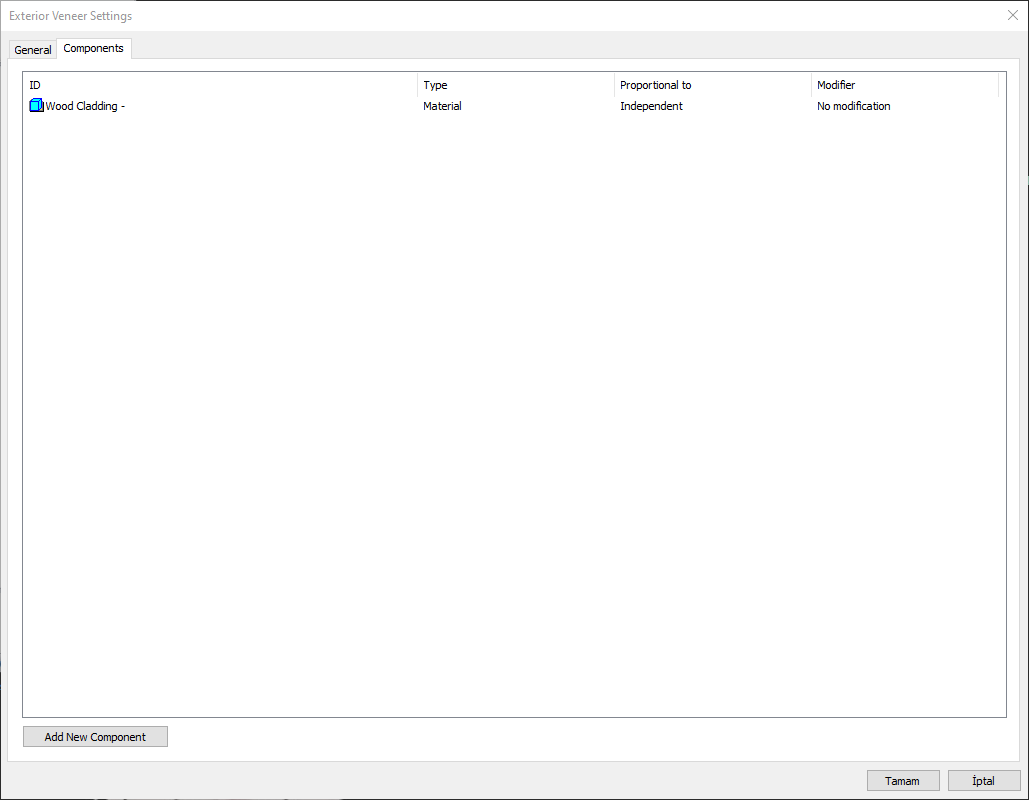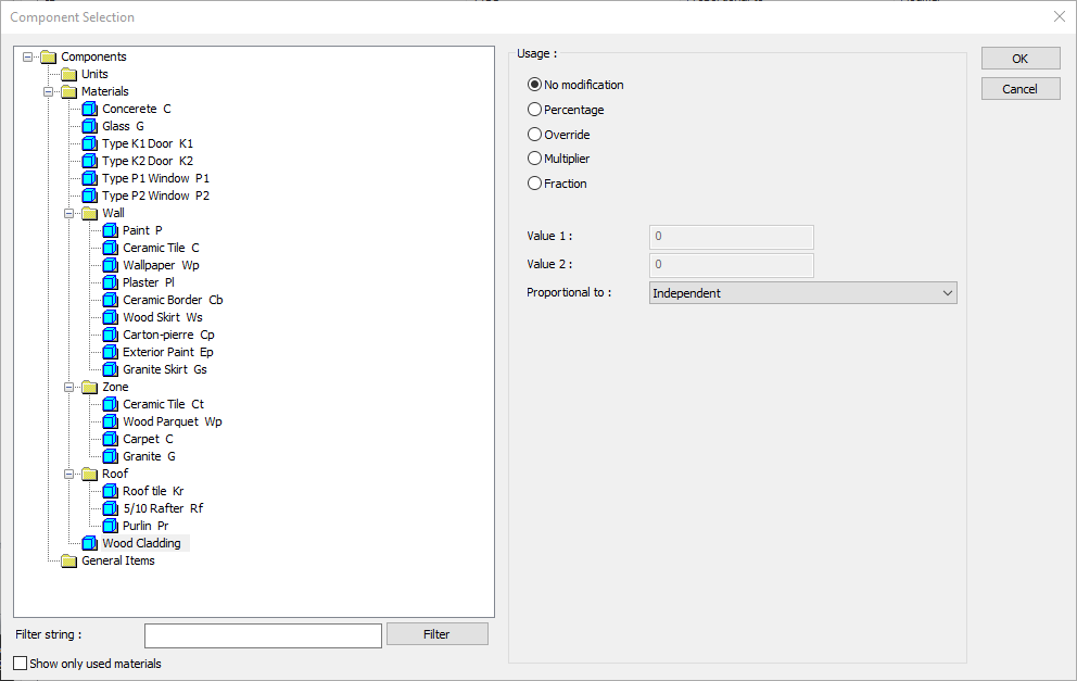 Click the OK button. The "Component Selection" dialog will be closed. A summary line of the material will appear in the Building Components tab. More than one material assignment can be made to an object.