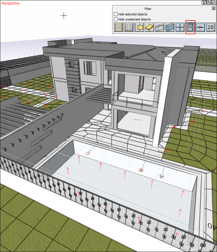 It is possible to hide and show the elements of the drawn model with the "Filter" menu in the perspective window. The filter menu is opened by clicking the filter icon in the upper right corner of the perspective window with the left mouse button.