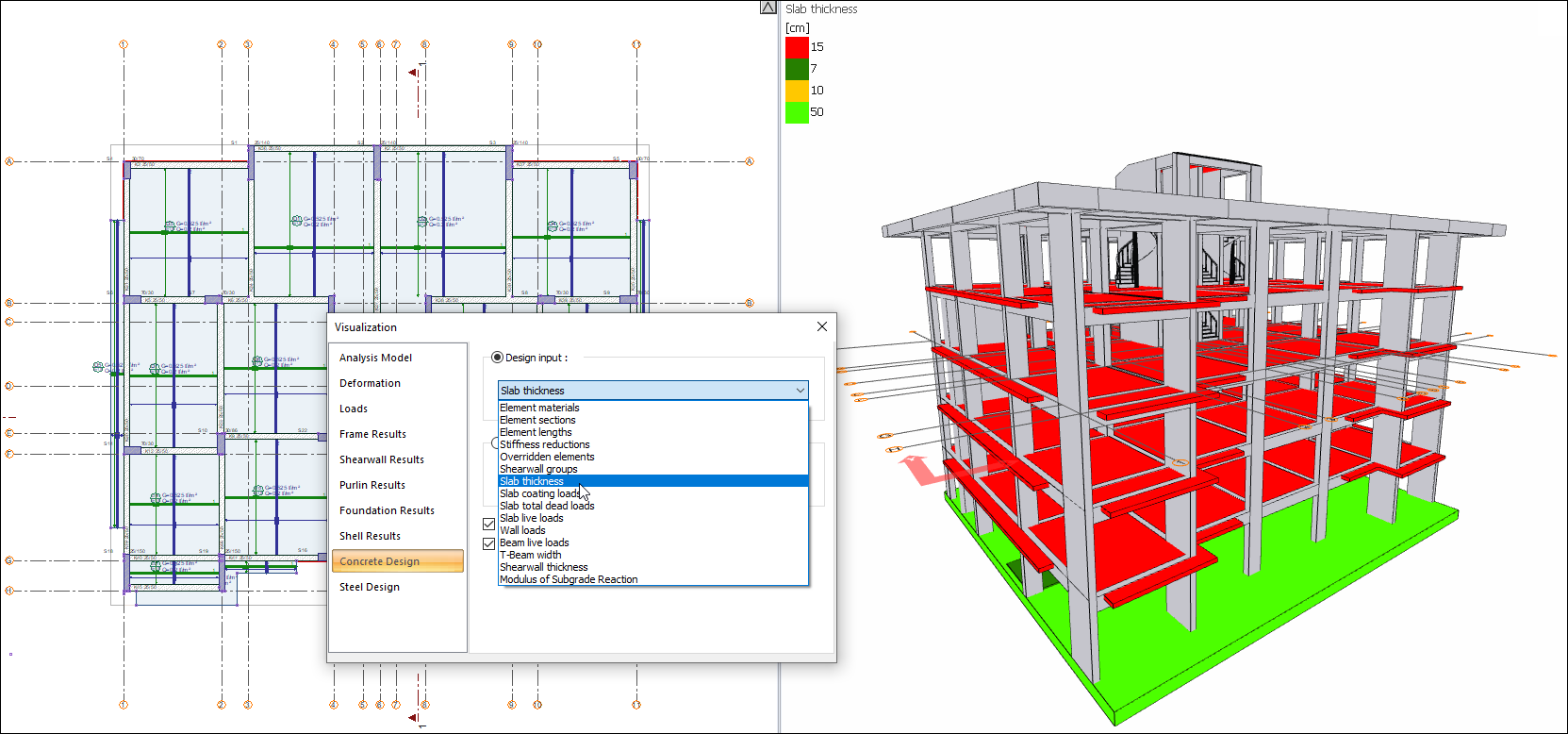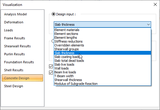 In the "Structural visualization options/Visualization/Concrete Design/Design input" tab in the right click menu on the 3D Screen, the information about design input is filtered as a color palette. Element materials used in concrete analysis+design, element sections, element lengths, slab thicknesses, cladding loads, live loads, wall loads, etc. The data entry information is controlled by the Structural visualization options/Visualization/Concrete Design/Design input view.