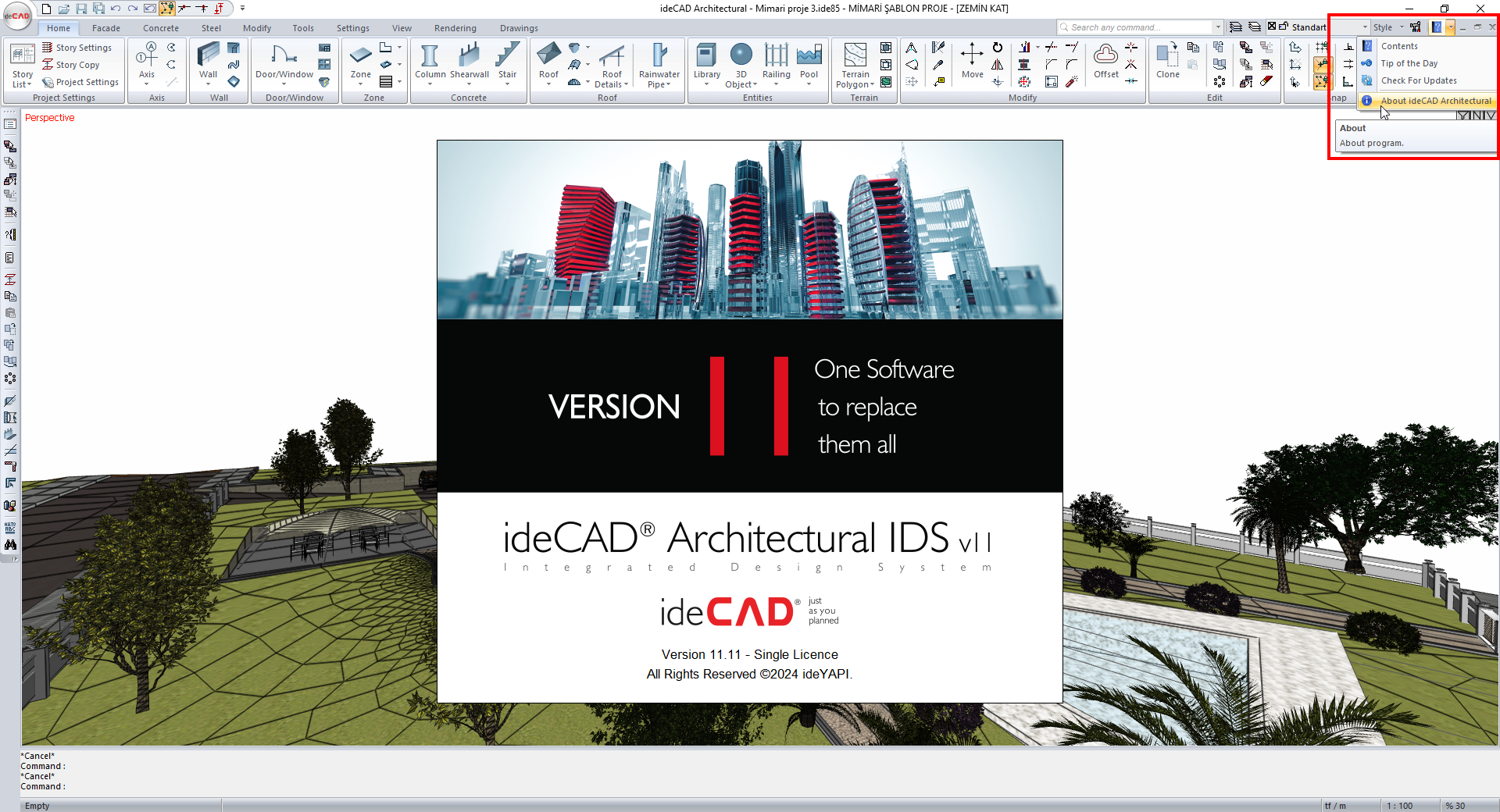 The ideCAD version is learned by clicking the arrow next to the help menu in the upper right corner of the ideCAD and selecting the "About İdeCAD Architecture/Structural" from the sub-headings.